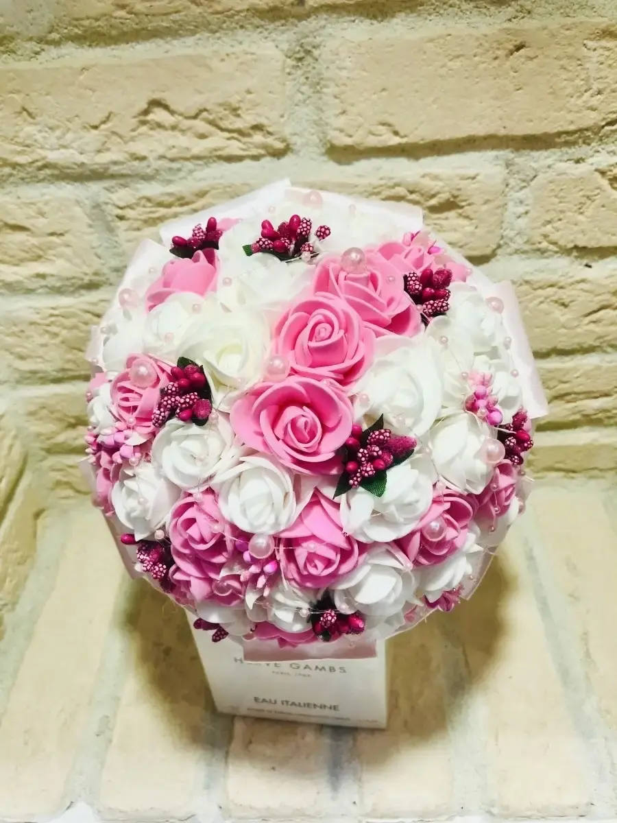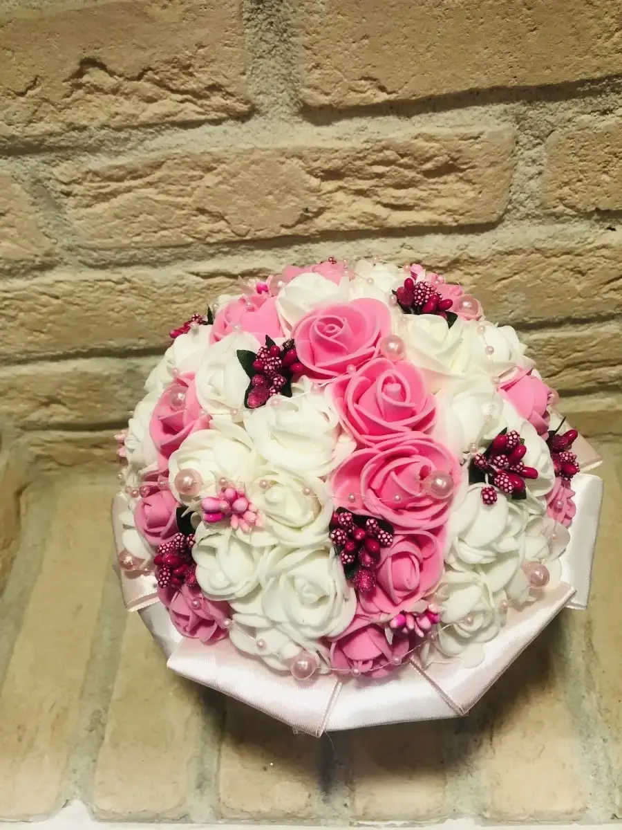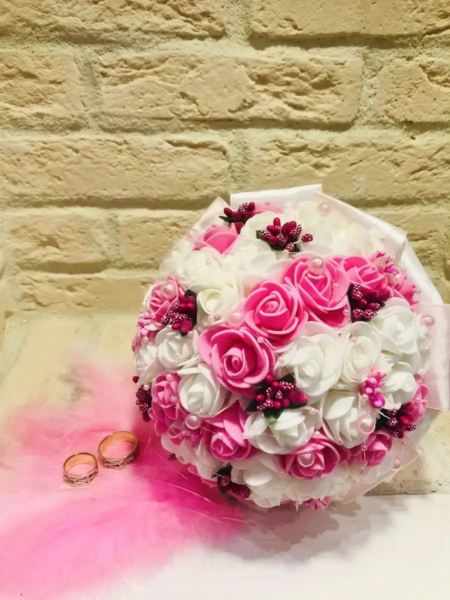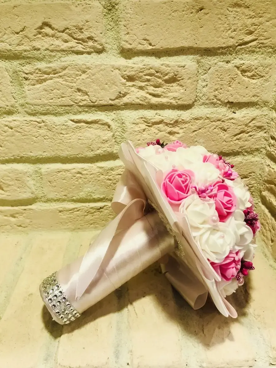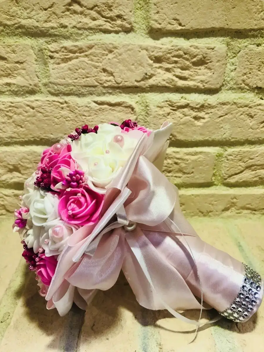 Букет-дублер,букет невесты предназначендля фотосессии и для традиционного завершения свадебного торжества ,когда невеста бросит его,повернувшись спиной к своим незамужним подружкам .Состоит букет из латексных цветов ,лент и бусинок . букет в диаметре 12 см и высотой20 см.