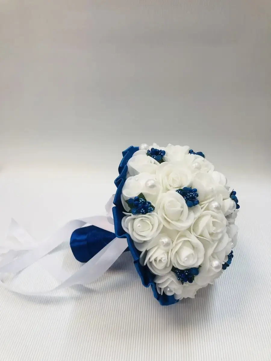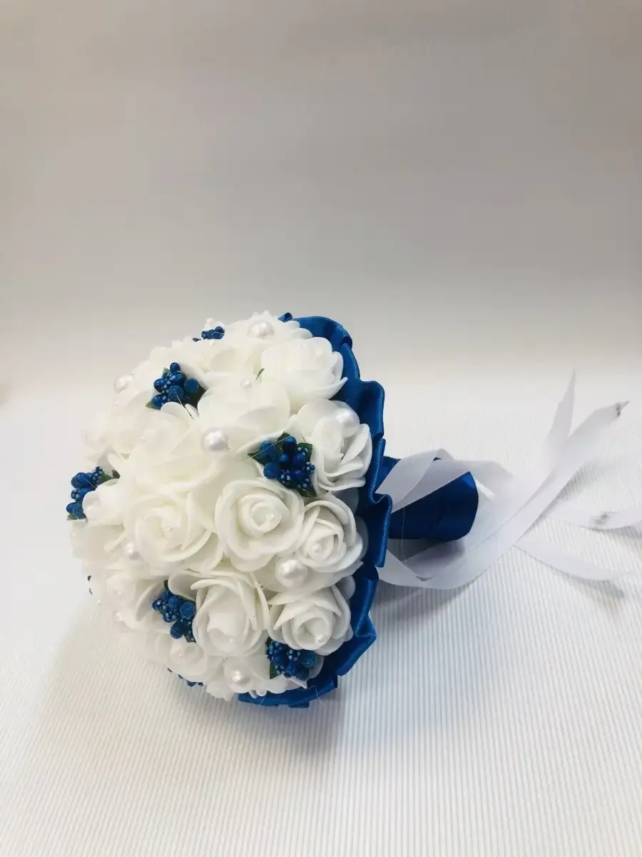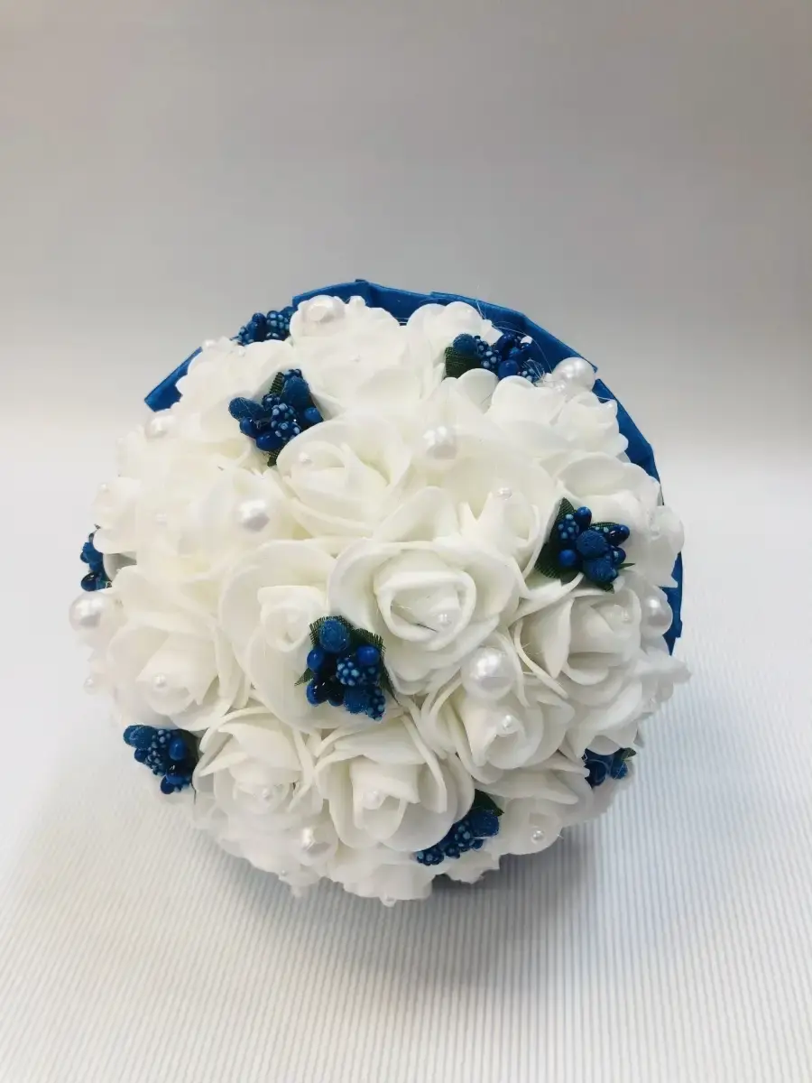 Букет-дублер,букет невесты предназначендля фотосессии и для традиционного завершения свадебного торжества ,когда невеста бросит его,повернувшись спиной к своим незамужним подружкам .Состоит букет из латексных цветов ,лент и бусинок . букет в диаметре 12 см и высотой20 см.