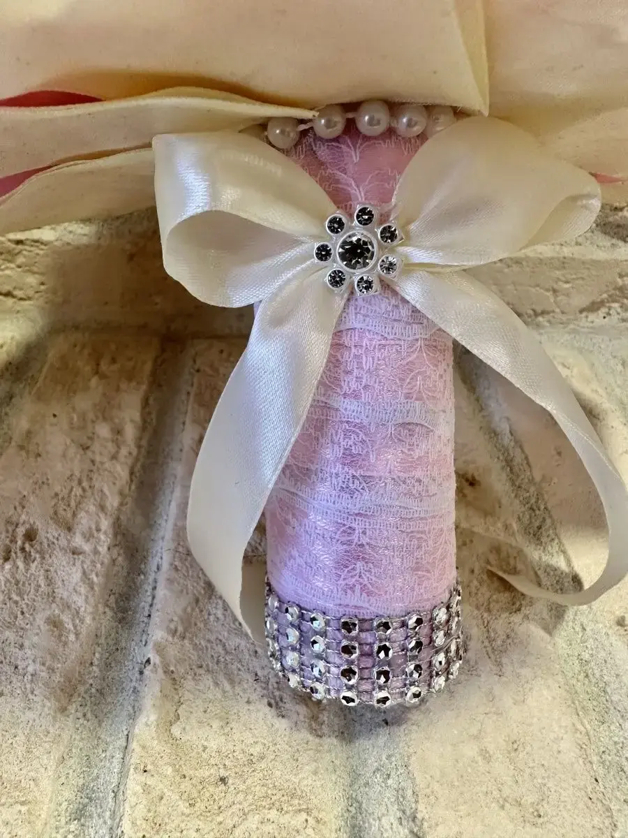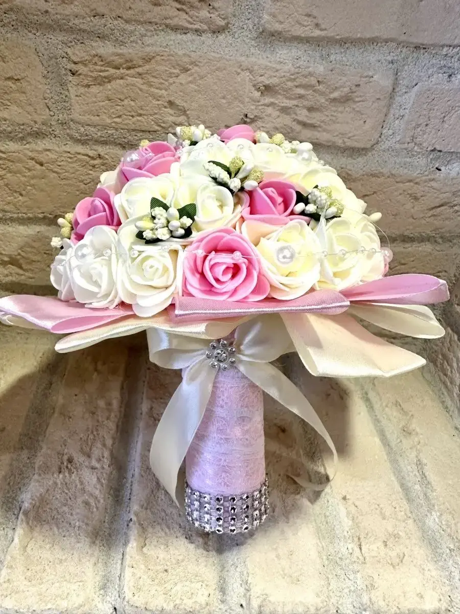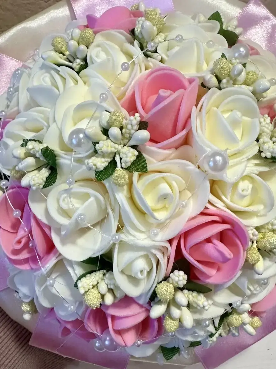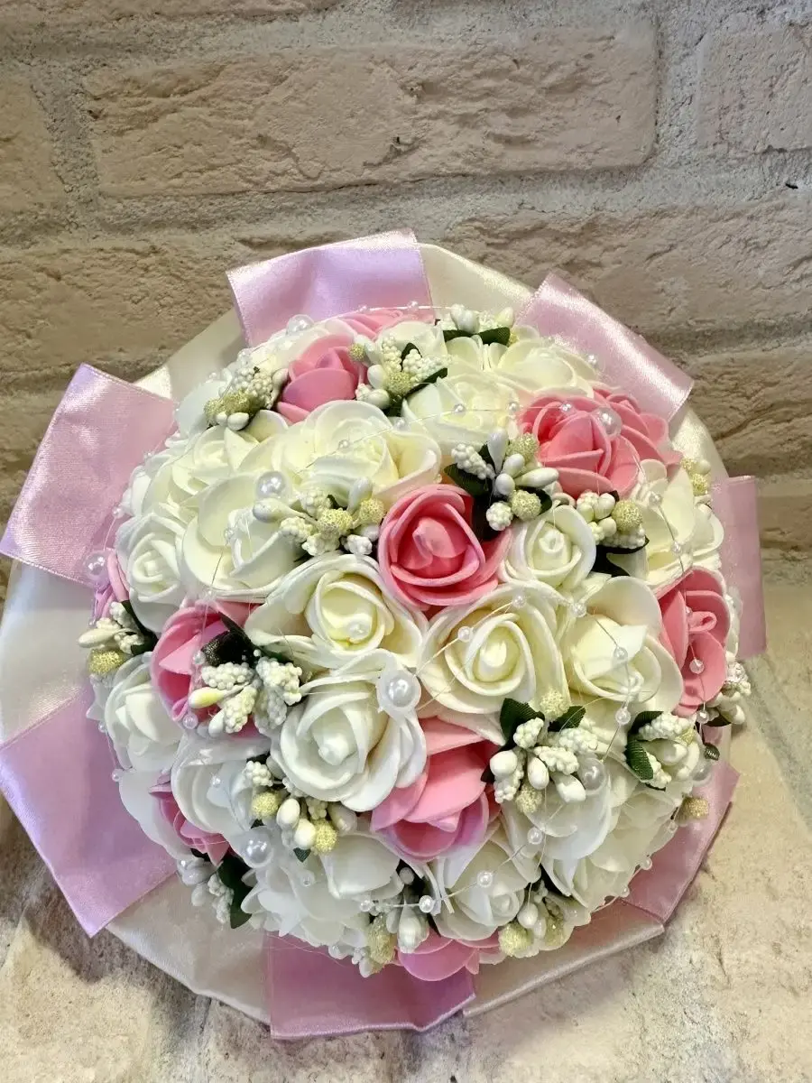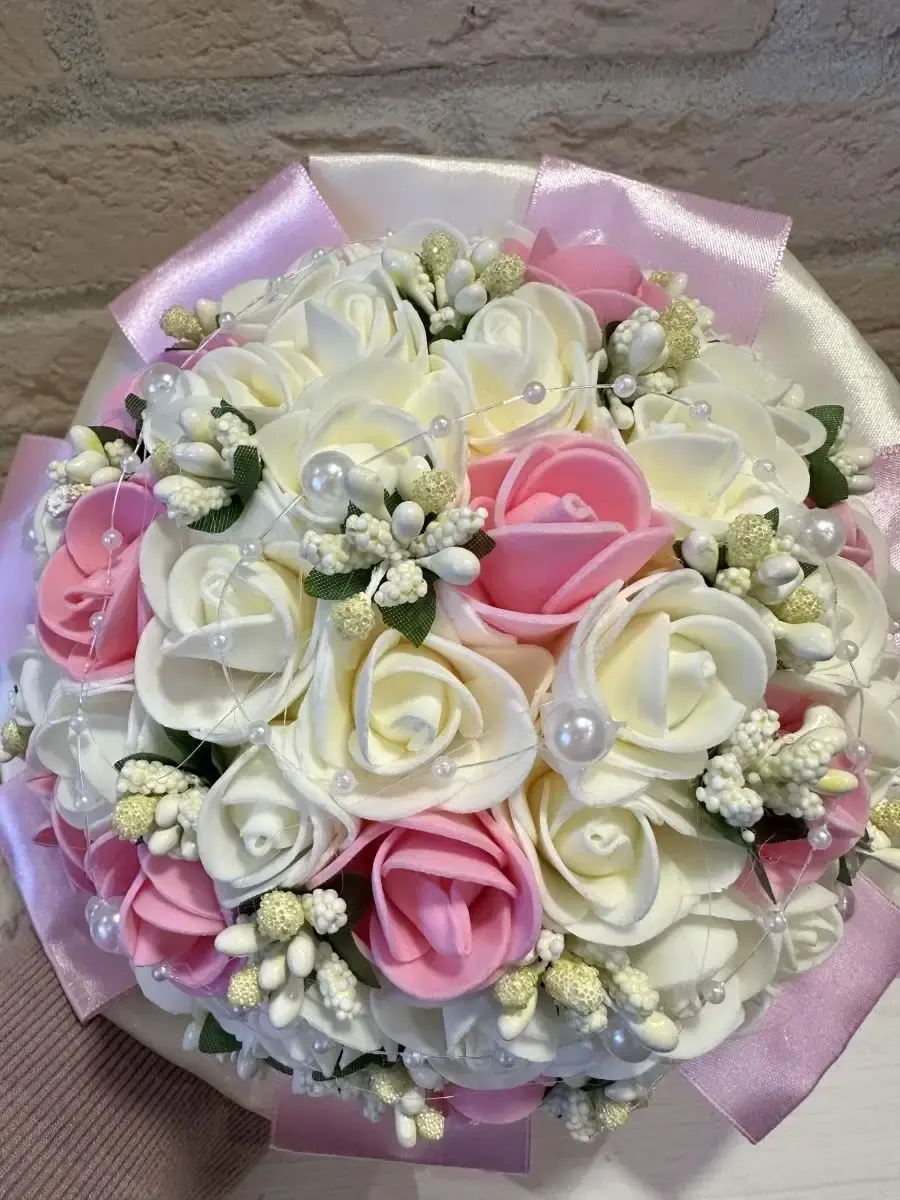 Букет-дублер,букет невесты предназначендля фотосессии и для традиционного завершения свадебного торжества ,когда невеста бросит его,повернувшись спиной к своим незамужним подружкам .Состоит букет из латексных цветов ,лент и бусинок . букет в диаметре 12 см и высотой20 см.