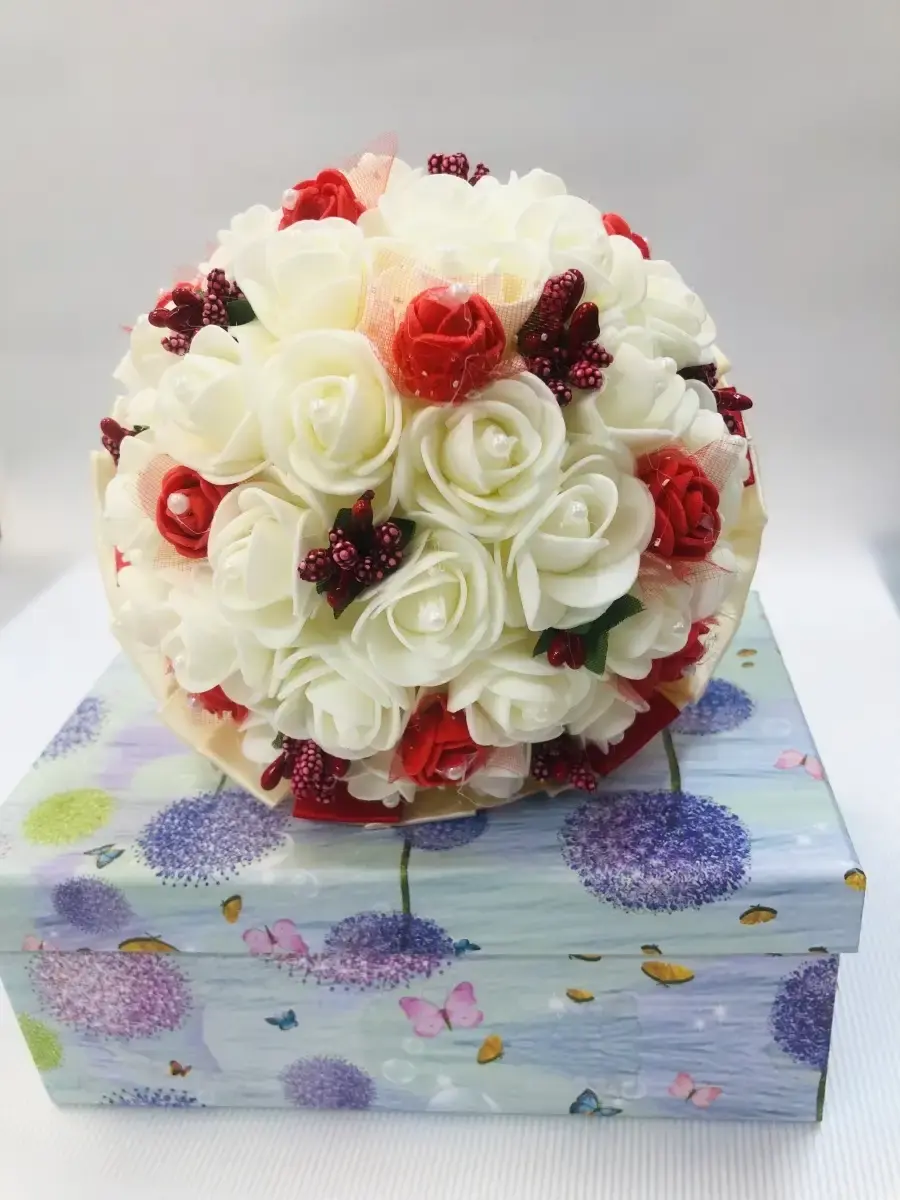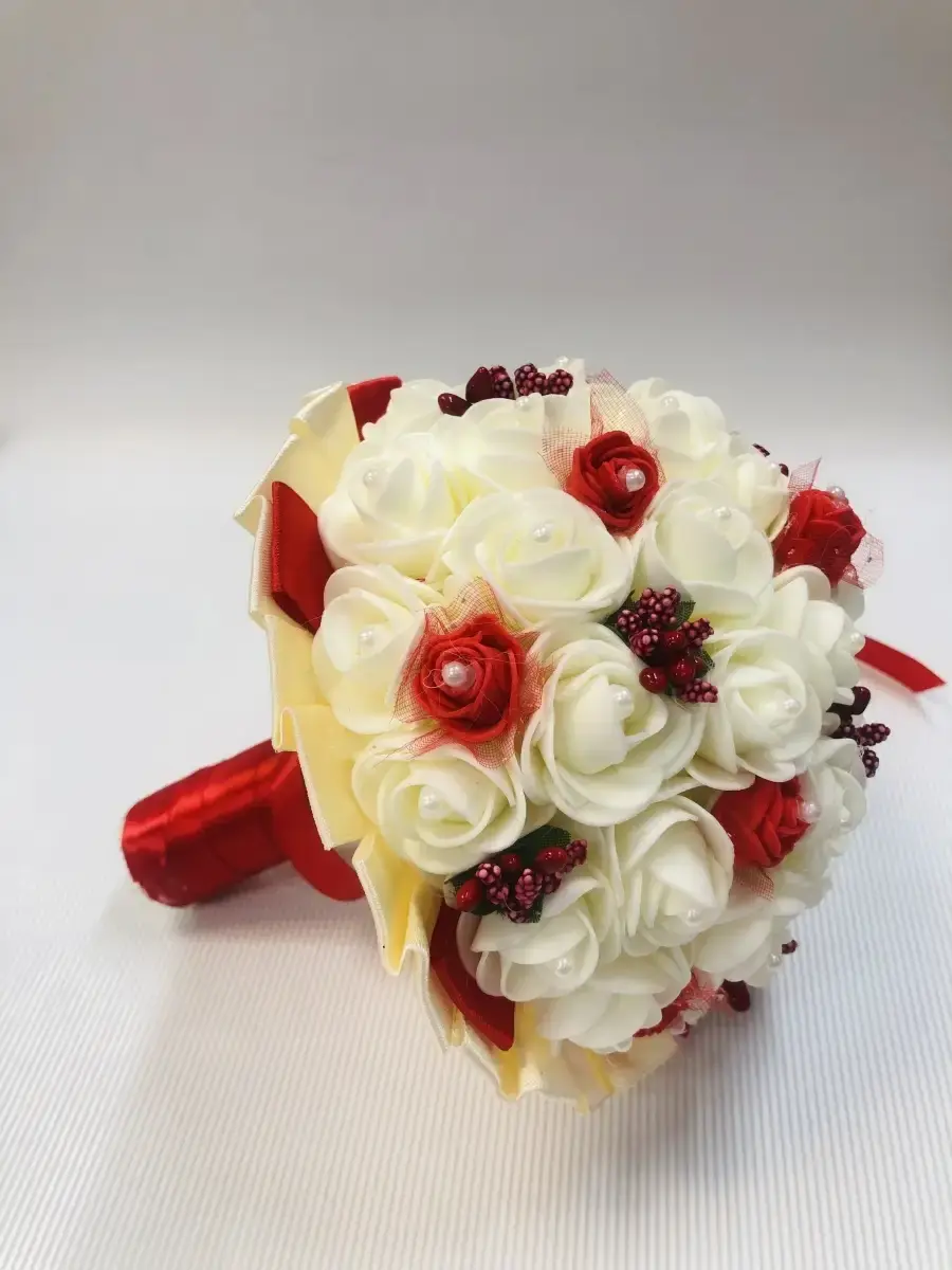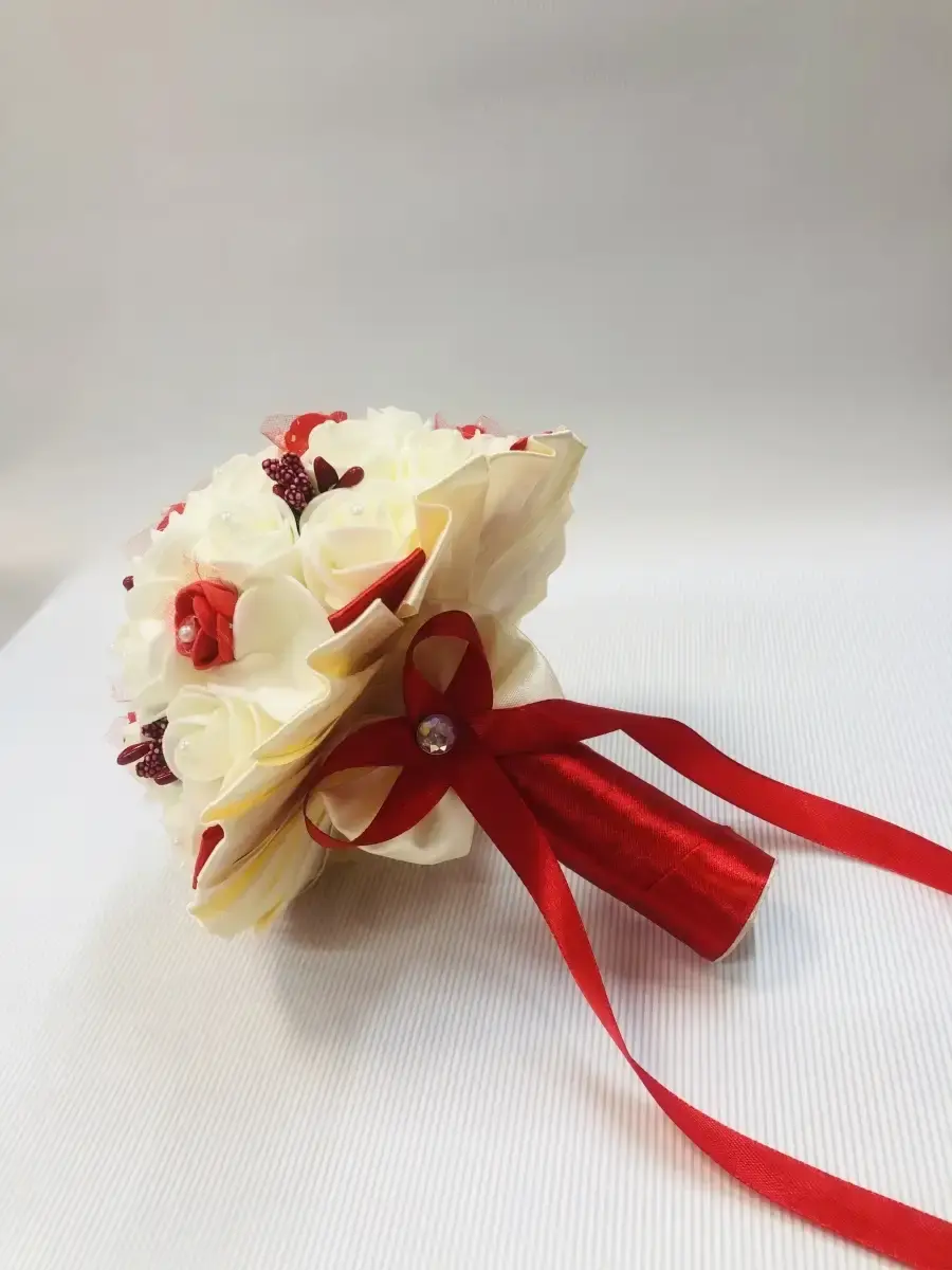 Букет-дублер,букет невесты предназначендля фотосессии и для традиционного завершения свадебного торжества ,когда невеста бросит его,повернувшись спиной к своим незамужним подружкам .Состоит букет из латексных цветов ,лент и бусинок . букет в диаметре 12 см и высотой20 см.