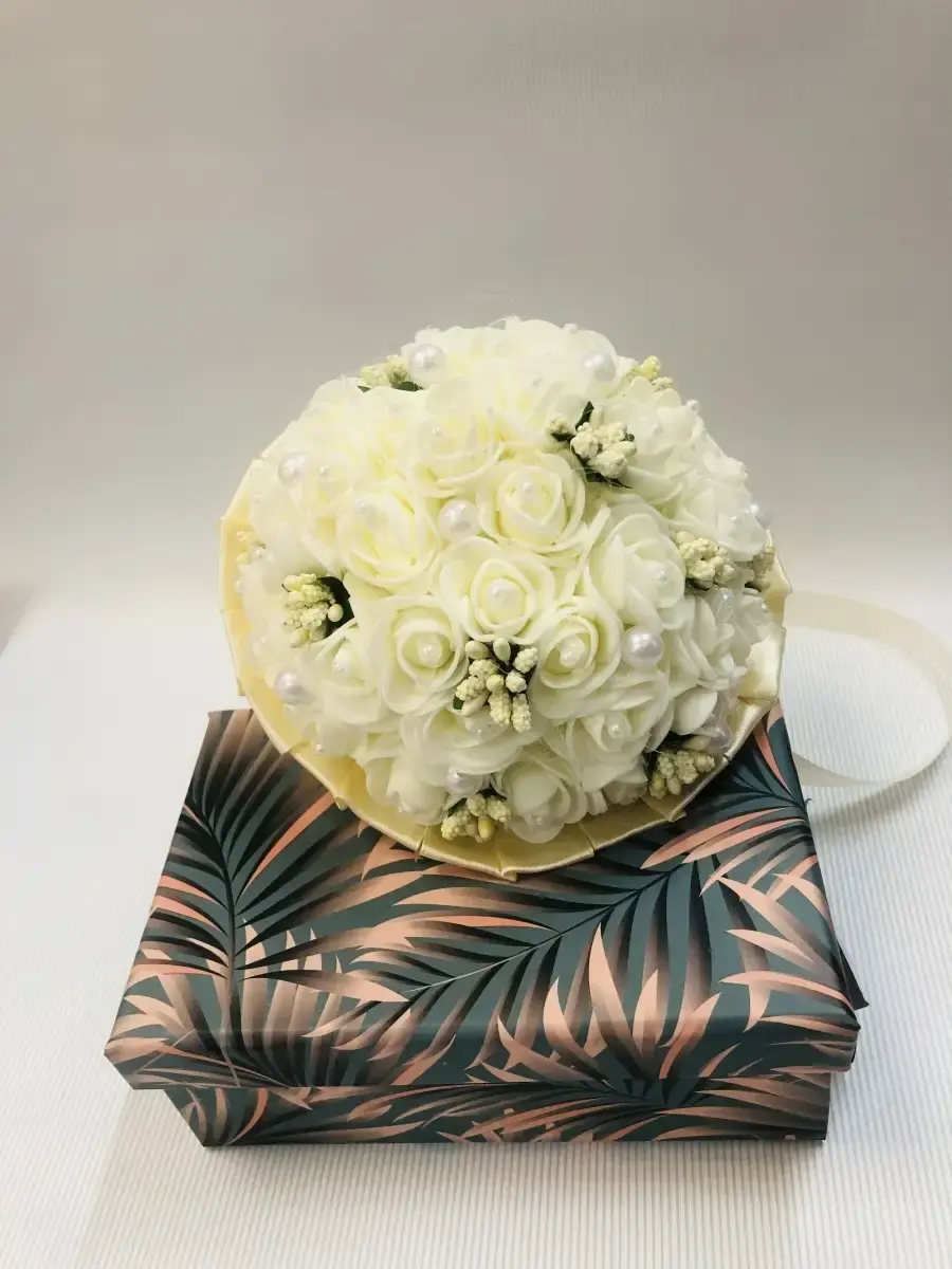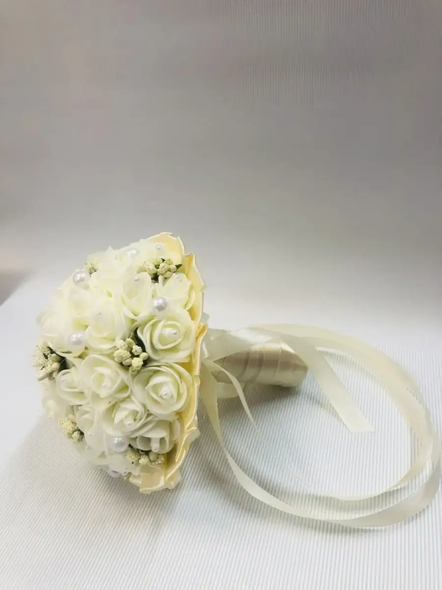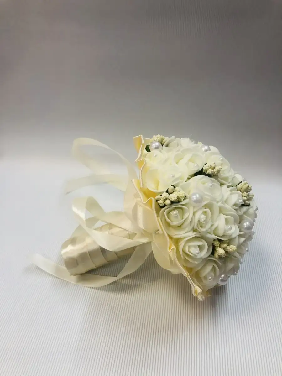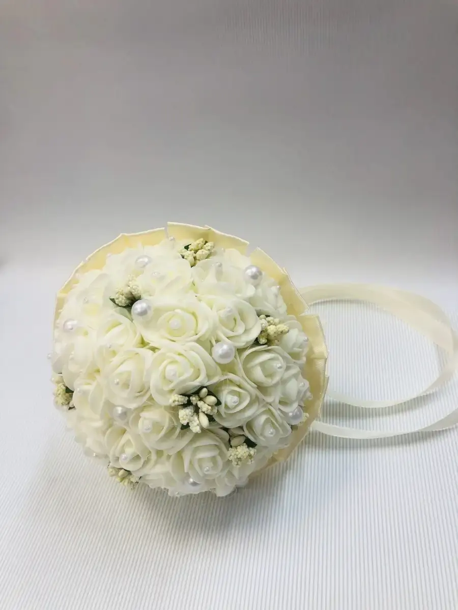 Букет-дублер,букет невесты предназначендля фотосессии и для традиционного завершения свадебного торжества ,когда невеста бросит его,повернувшись спиной к своим незамужним подружкам .Состоит букет из латексных цветов ,лент и бусинок . букет в диаметре 12 см и высотой20 см.