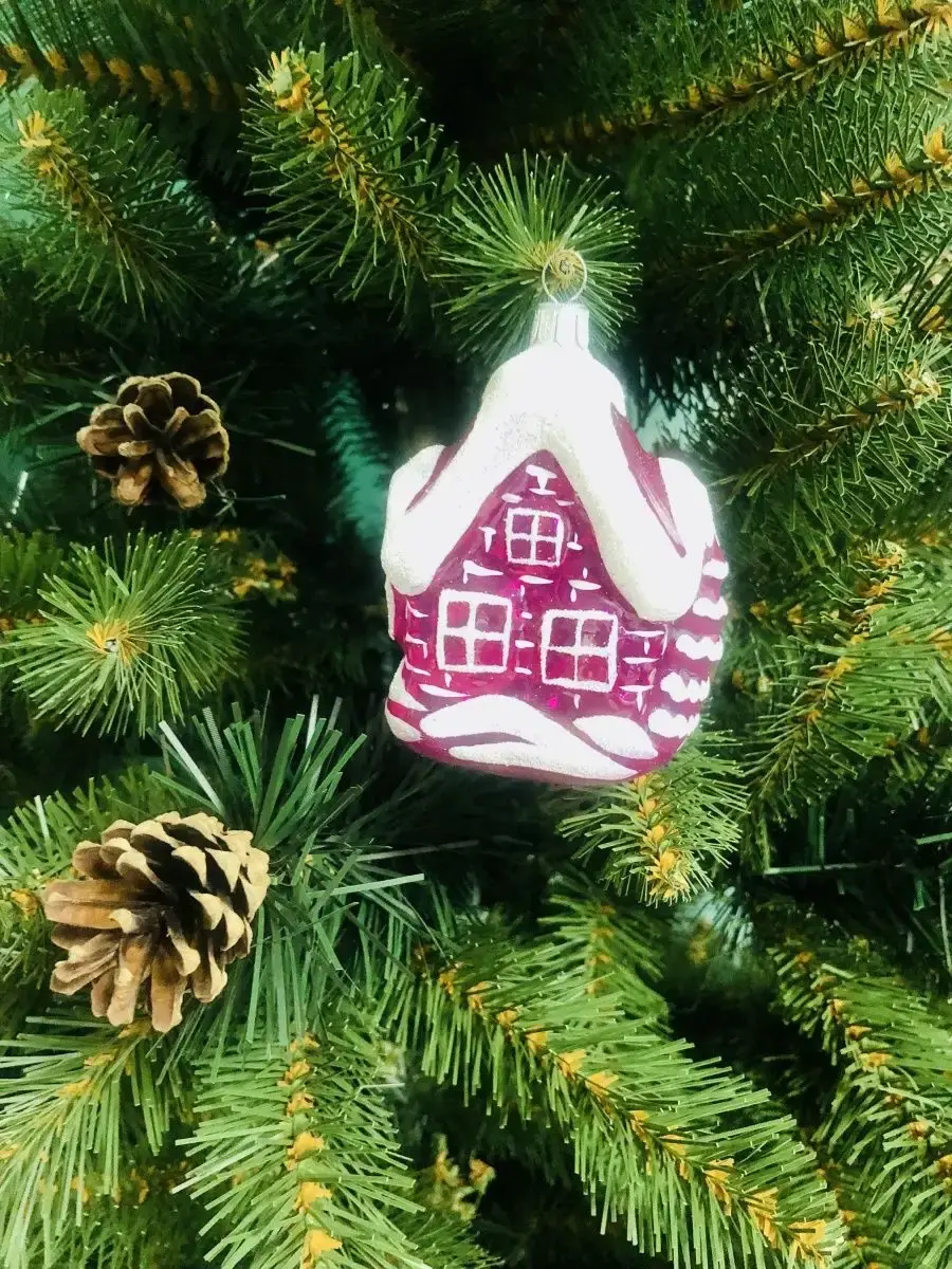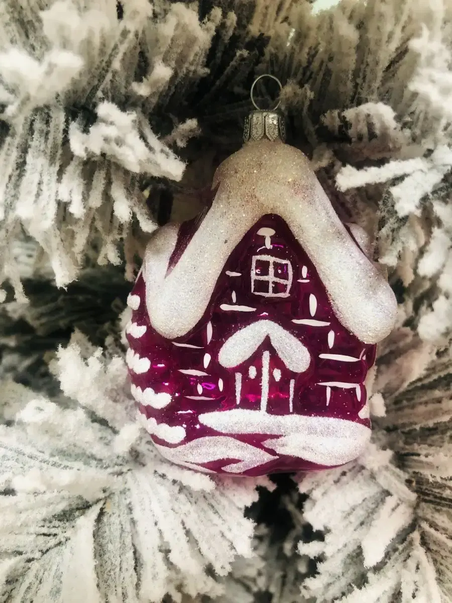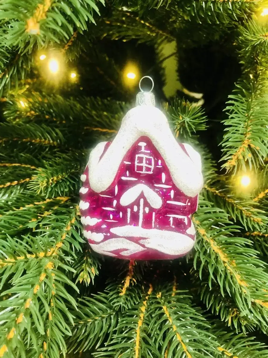 Шар ёлочный стеклянный декорированный. Елочный шар прекрасно выглядит на елке и также может быть замечательным сувенирным подарком во время Рождественских походов в гости. Елочная игрушка - символ Нового года и Рождества. Особенностью стеклянного елочного шара является художественная роспись. Яркие шары с красивыми рисунками помогут создать праздничное настроение. Упакован в подарочную упаковку.Шар в форме домика с елочкой высотой 9 см