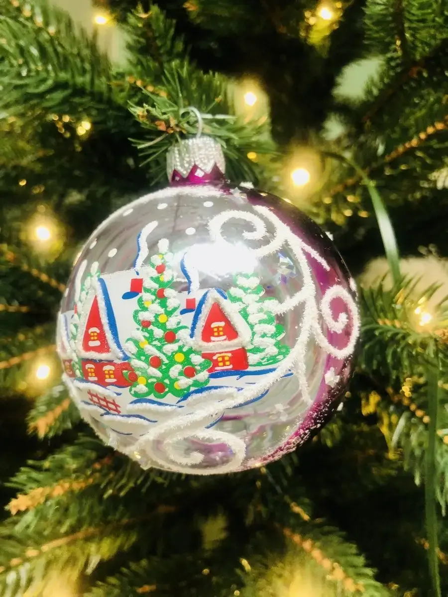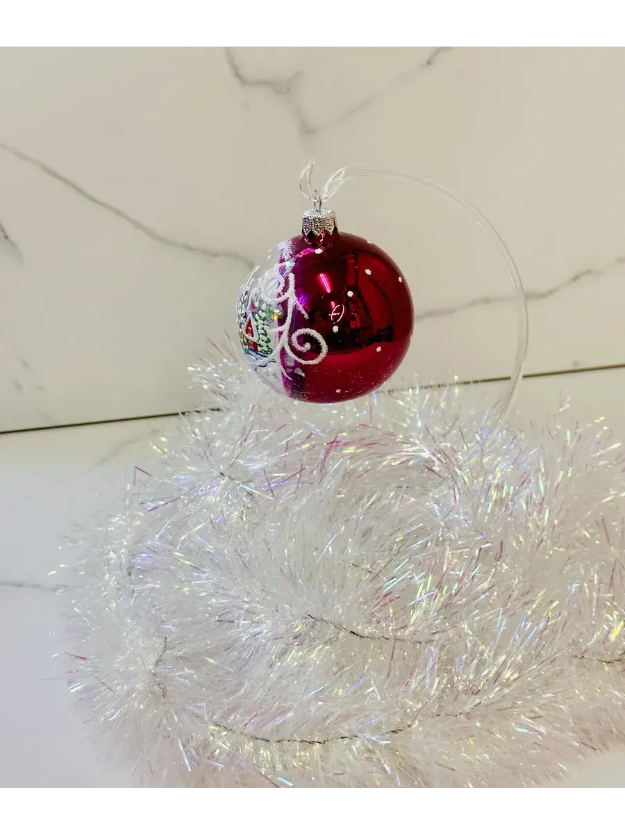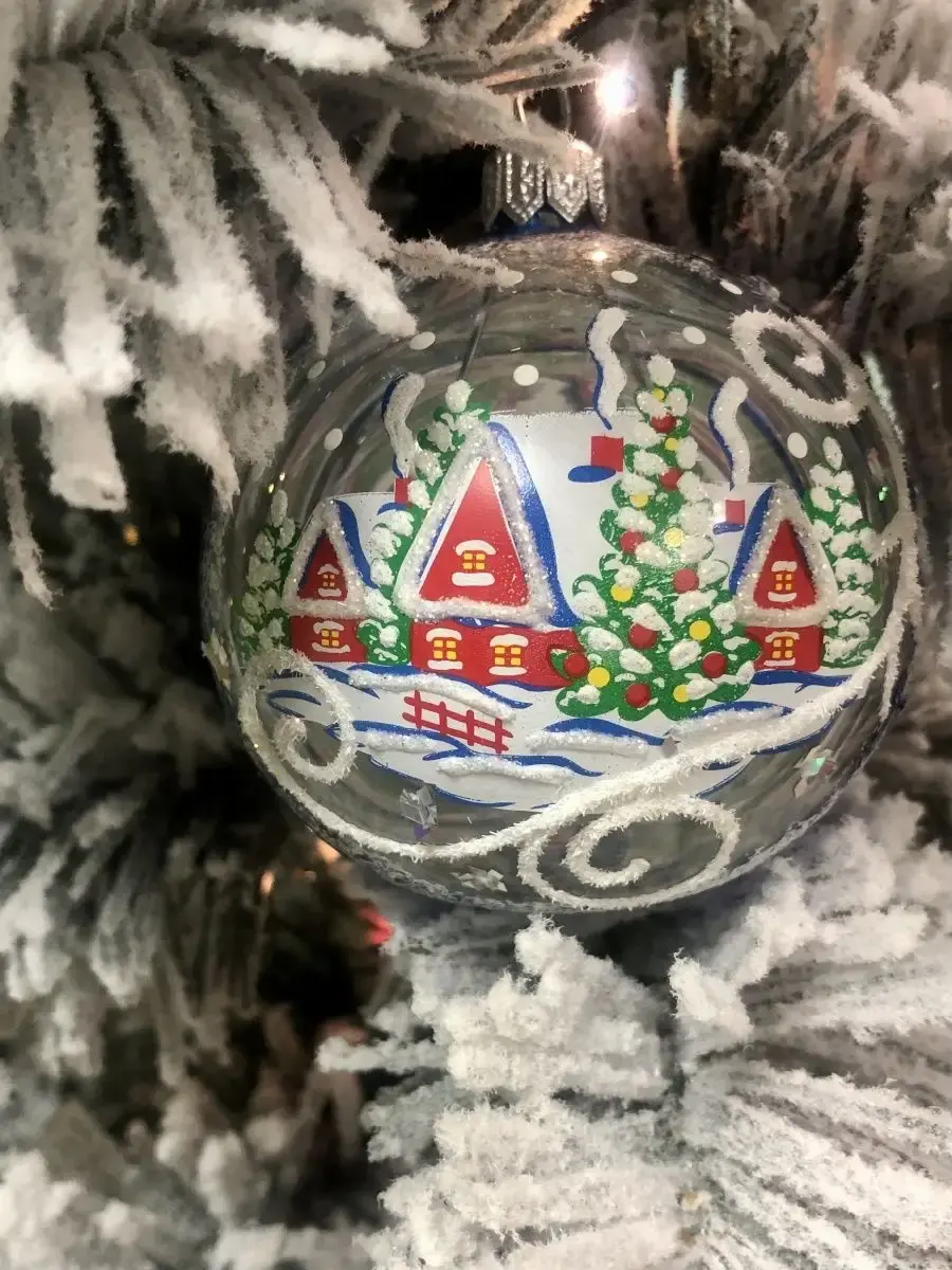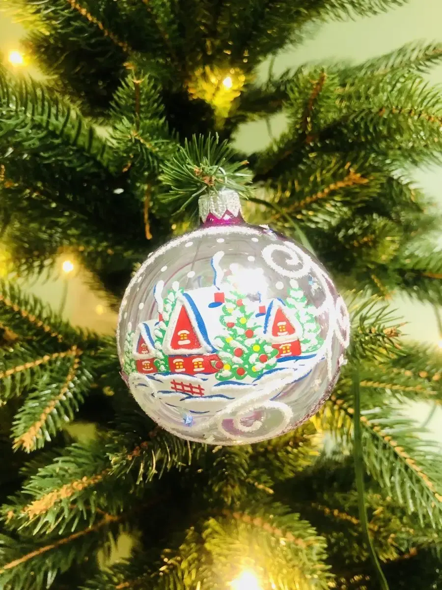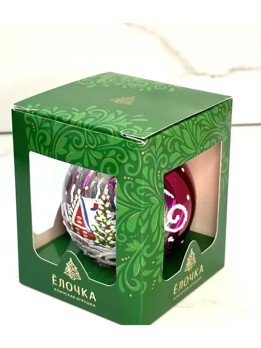 Стеклянный елочный шар диаметром 75 мм ручной работы. Данное елочное украшение будет прекрасным подарком и будет самым красивым украшением для вашей елки.