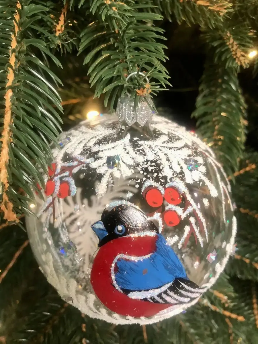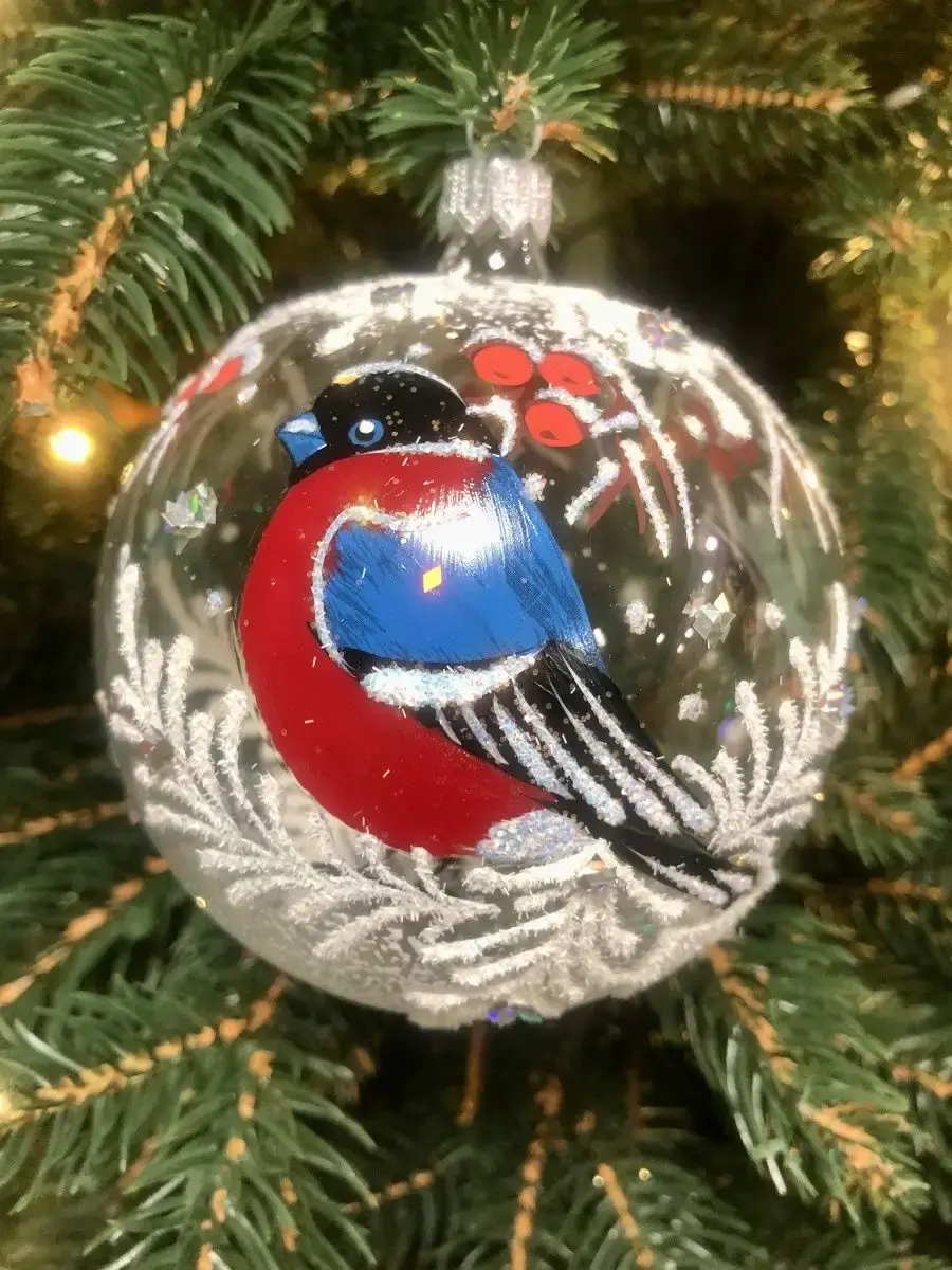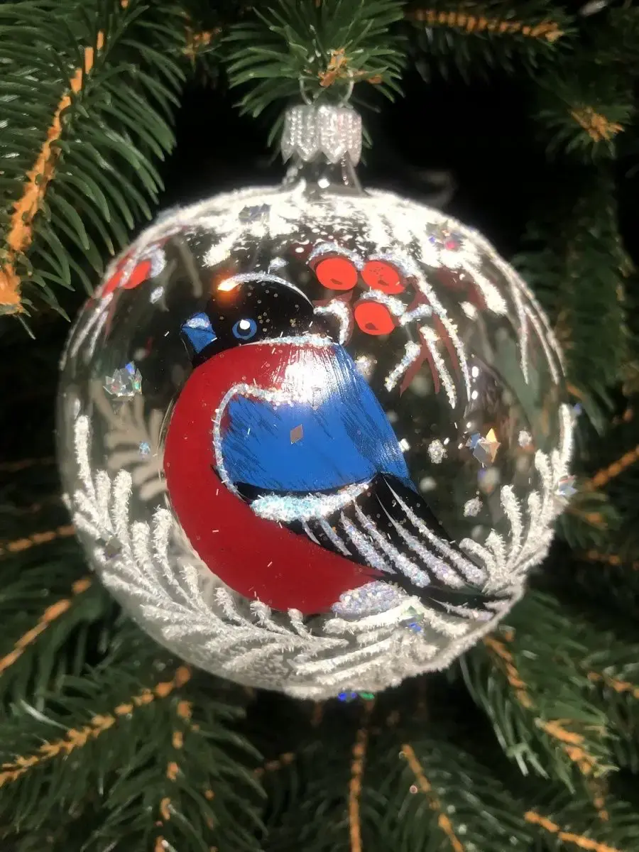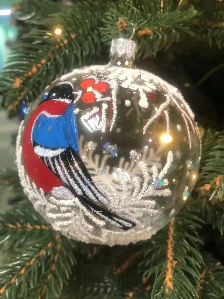 Шар ёлочный стеклянный декорированный. Елочный шар прекрасно выглядит на елке и также может быть замечательным сувенирным подарком во время Рождественских походов в гости. Елочная игрушка - символ Нового года и Рождества. Особенностью стеклянного елочного шара является художественная роспись. Яркие шары с красивыми рисунками помогут создать праздничное настроение. Упакован в подарочную упаковку. Диаметр шара 90 мм.