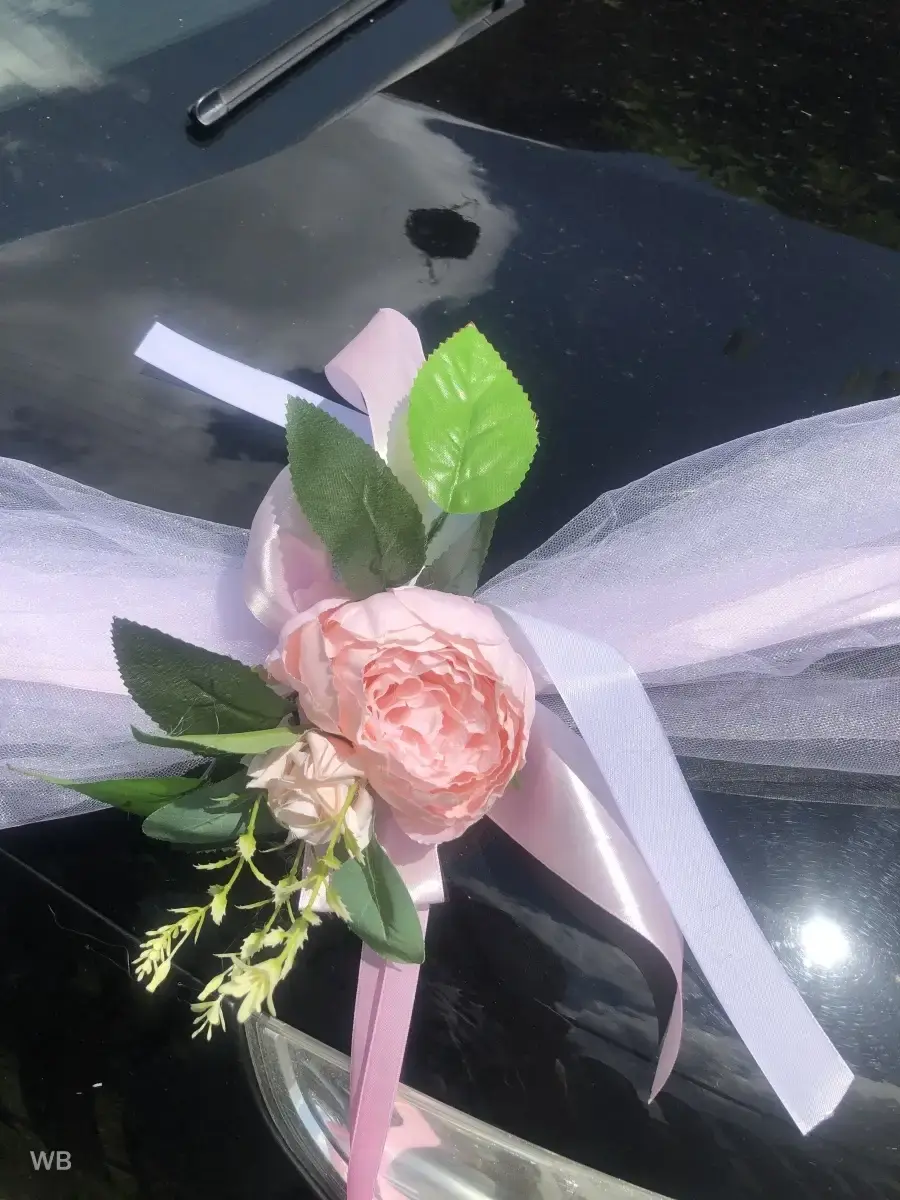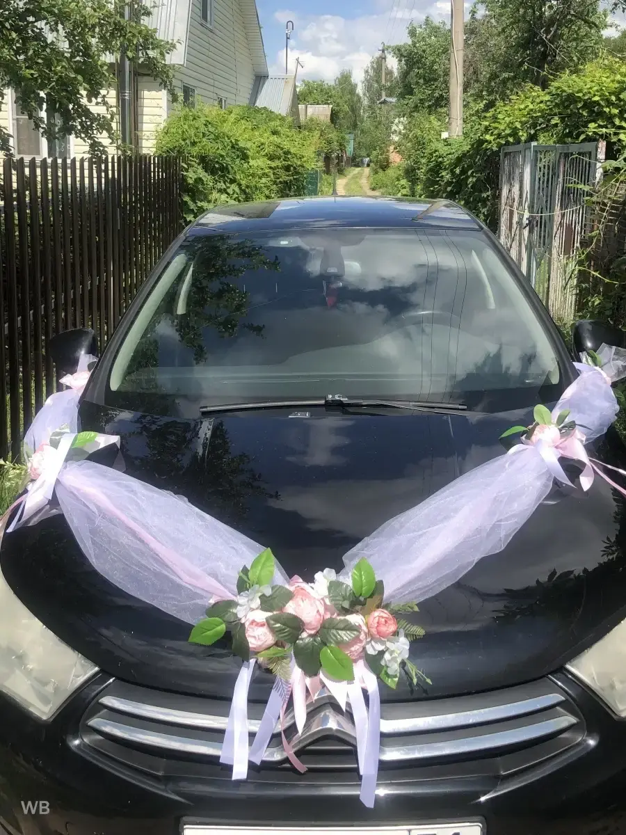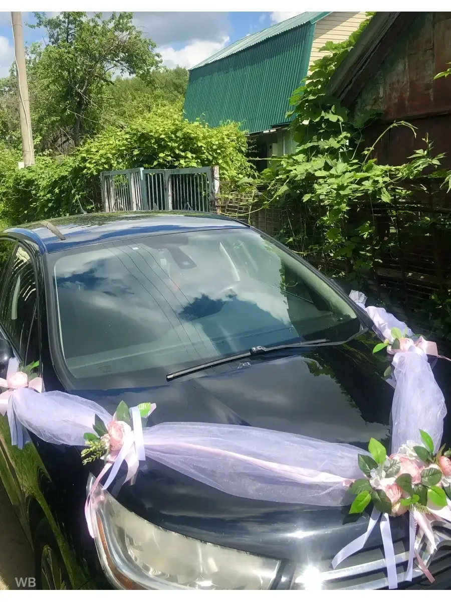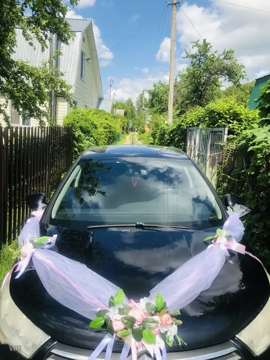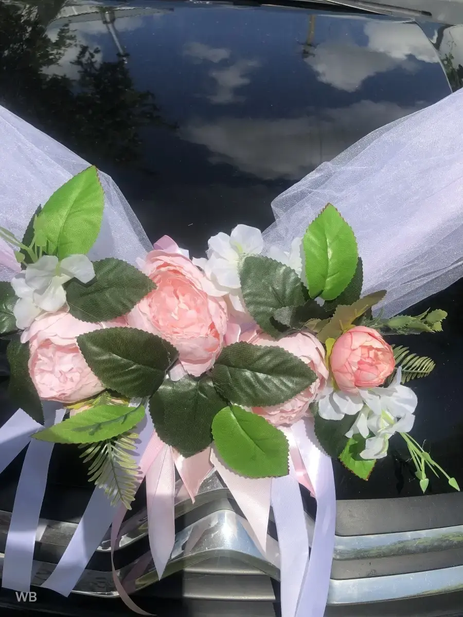 Свадебное украшение на капот автомобиля.V-образная лента закрепляется рядом с решеткой радиатора концы лучей под капотом возле зеркал заднего вида. Композиция выполнена из воздушного фатина с множеством лент ,цветов пионов и зелени. Подойдет на любую марку автомобиля и украсить любой кортеж.