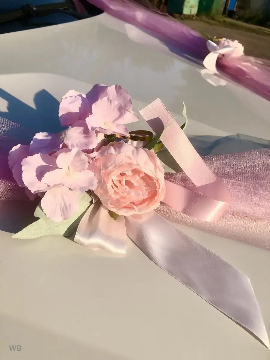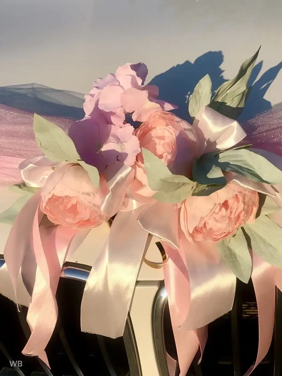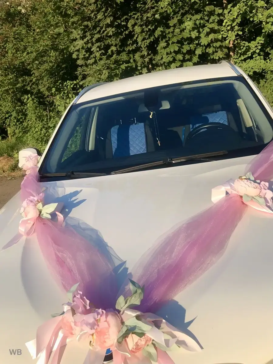 Свадебное украшение на капот автомобиля.V-образная лента закрепляется рядом с решеткой радиатора концы лучей под капотом возле зеркал заднего вида. Композиция выполнена из воздушного фатина с множеством лент ,цветов пионов и зелени. Подойдет на любую марку автомобиля и украсить любой кортеж.
