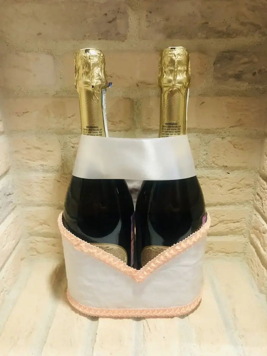 Украшение на шампанское - непременный атрибут любой свадьбы. Этот элегантный и изысканный аксессуар добавит особую нотку романтики и шарма в ваше торжество. Белый, кружевной, с элементами ленты, оно станет настоящим украшением вашего стола и сделает момент распечатывания шампанского по-настоящему праздничным.