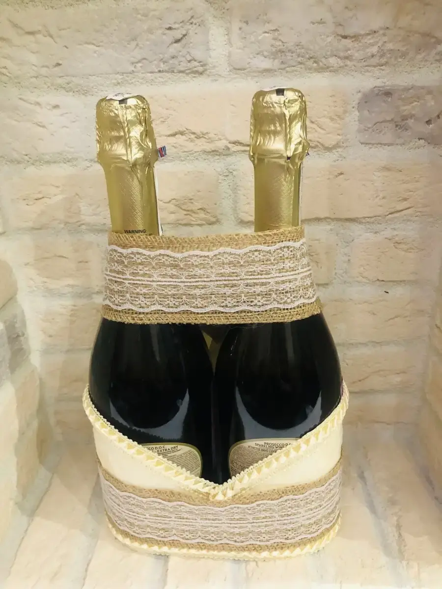 Не упустите возможность добавить неповторимый шарм и элегантность вашей свадьбе.Закажите украшение на шампанское прямо сейчас и получите незабываемые моменты радости и веселья. Наши украшения - это идеальный выбор для тех, кто ценит красоту и стиль, и хочет сделать свой праздник по-настоящему незабываемым.Украшение шампанского выполнено из плотной дизайнерской бумаги белого цвета, декорировано белым кружевом и атласными лентами, а также белой латексной розочкой. В комплект входит бант из белоснежной атласной ленты, который легко крепится на горлышках. Украсить бутылки очень просто, достаточно надеть на бутылки с шампанским украшение и выставить бутылки рядом с бокалами на стол молодых!